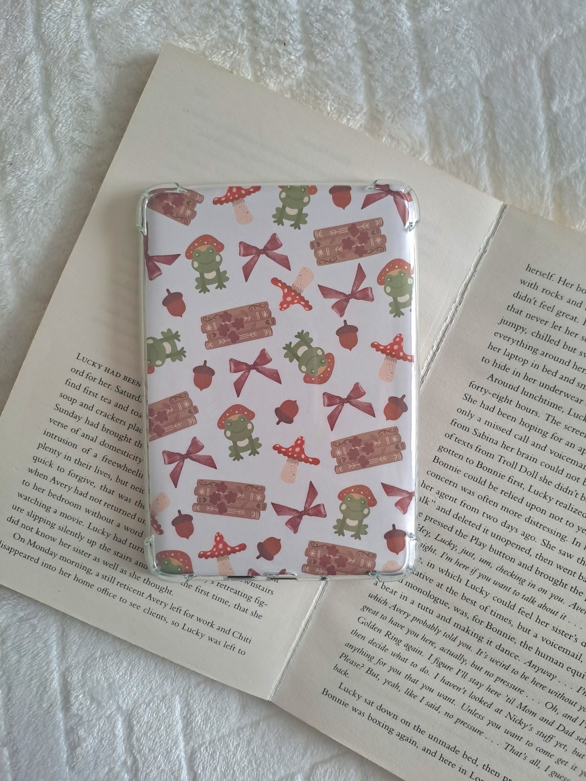 A whimsical kindle insert featuring frogs, toadstool and books. A perfect autumnal reading accessory.