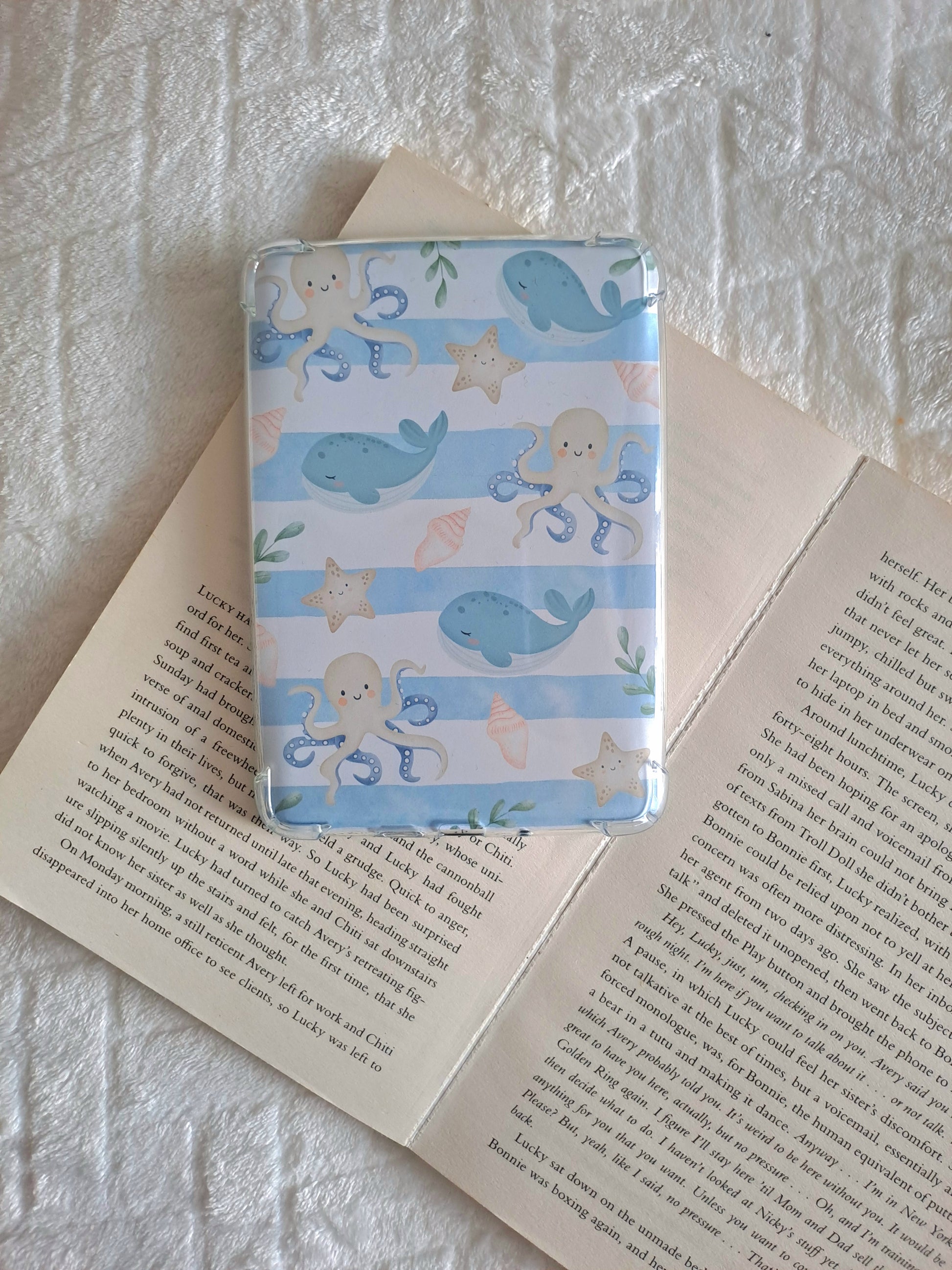 Under the sea kindle skin for book lovers featuring beautiful water coloured Whales, Octopus's and star fish.