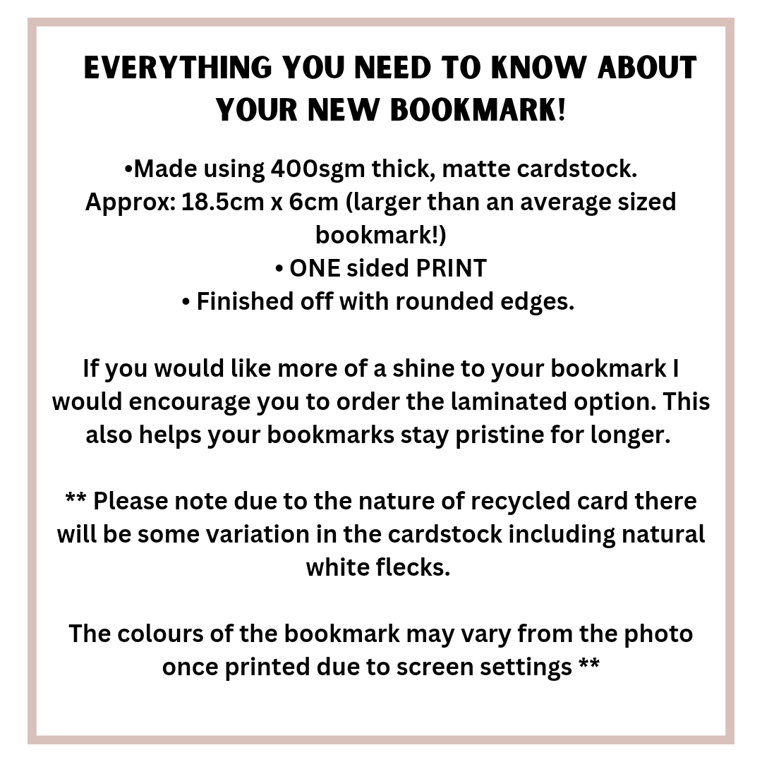 The colours of the bookmark may vary from the photo once printed due to screen settings **