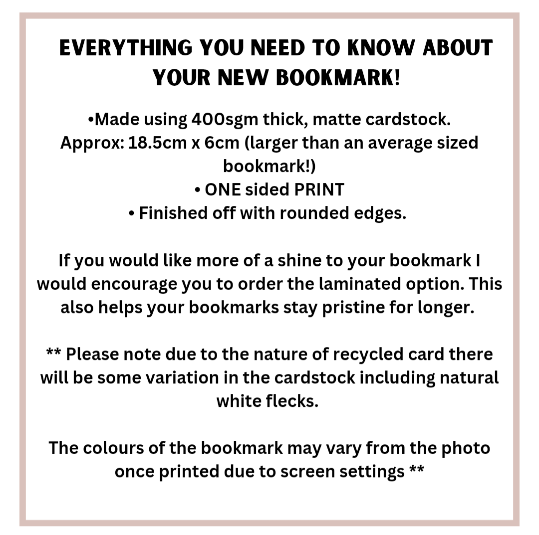 The colours of the bookmark may vary from the photo once printed due to screen settings **
